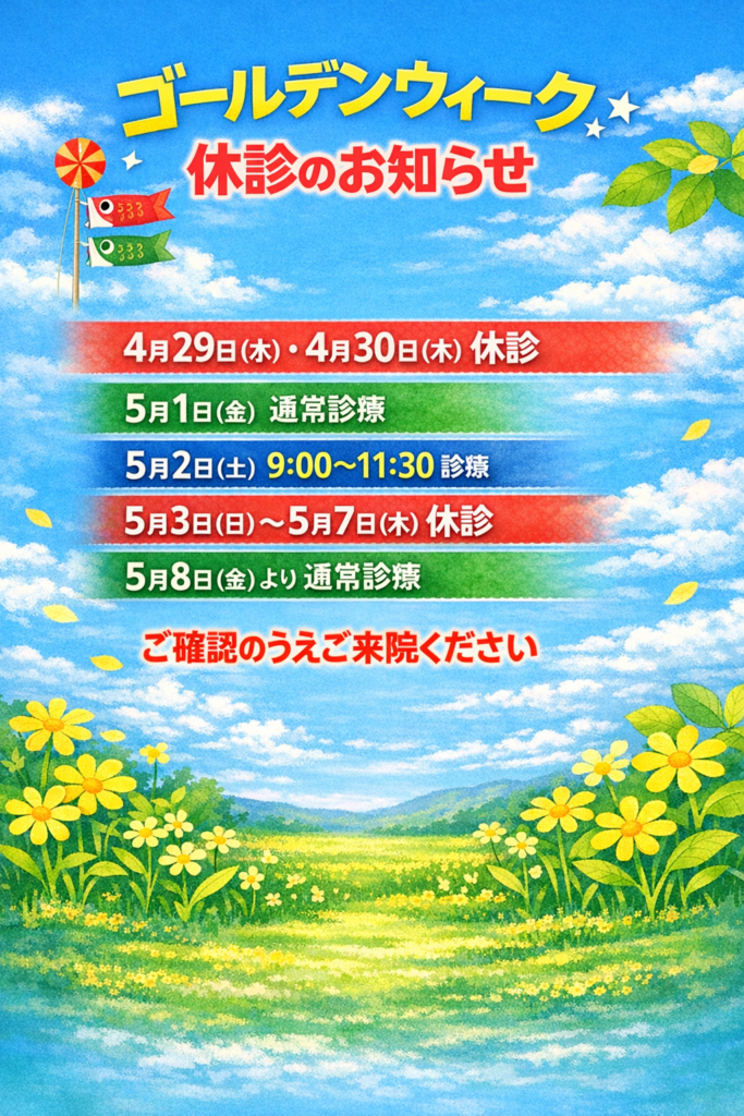 5月2日(土)は、連休前の院内清掃のため、また当日の混雑が予想されるため、受付時間を短縮しております。ご来院の際は、どうぞお間違えのないようご確認をお願いいたします。